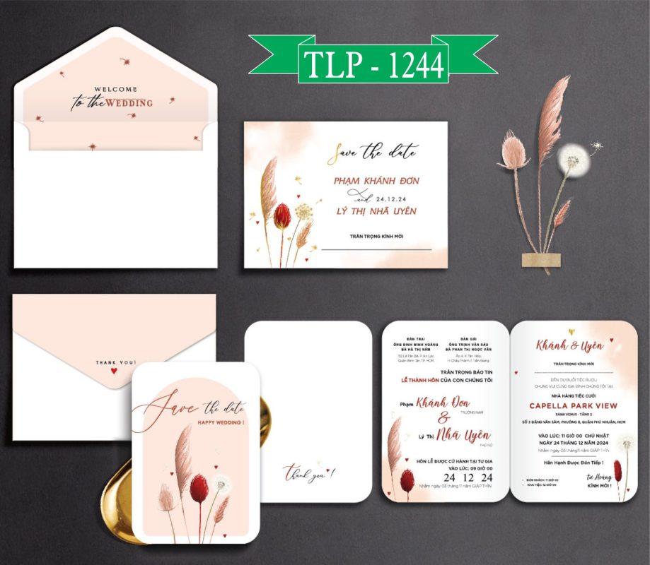 Mẫu thiệp cưới ngang nắp chéo đẹp giá rẻ họa tiết cỏ bong lau màu kem loang cam