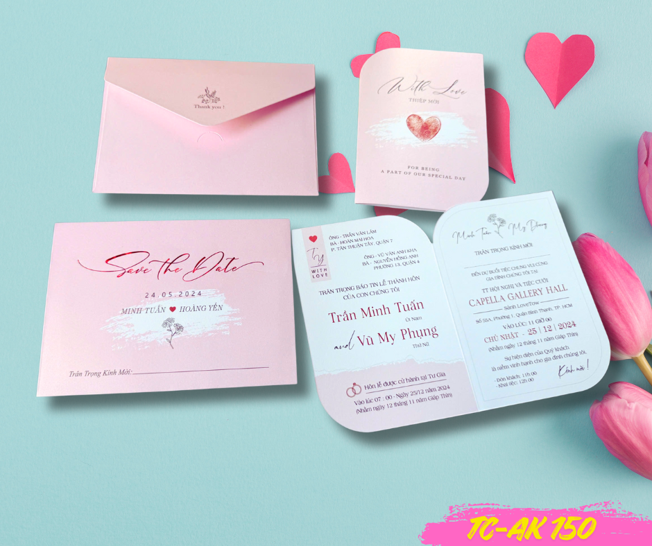 Mẫu Thiệp cưới giấy ánh kim thơm màu hồng pastel save the date vết sơn nghệ thuật