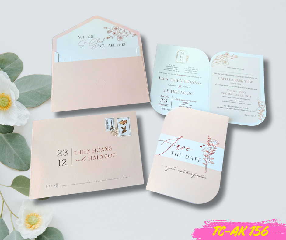 Mẫu Thiệp cưới giấy ánh kim thơm màu hồng pastel tem hoa và tháp