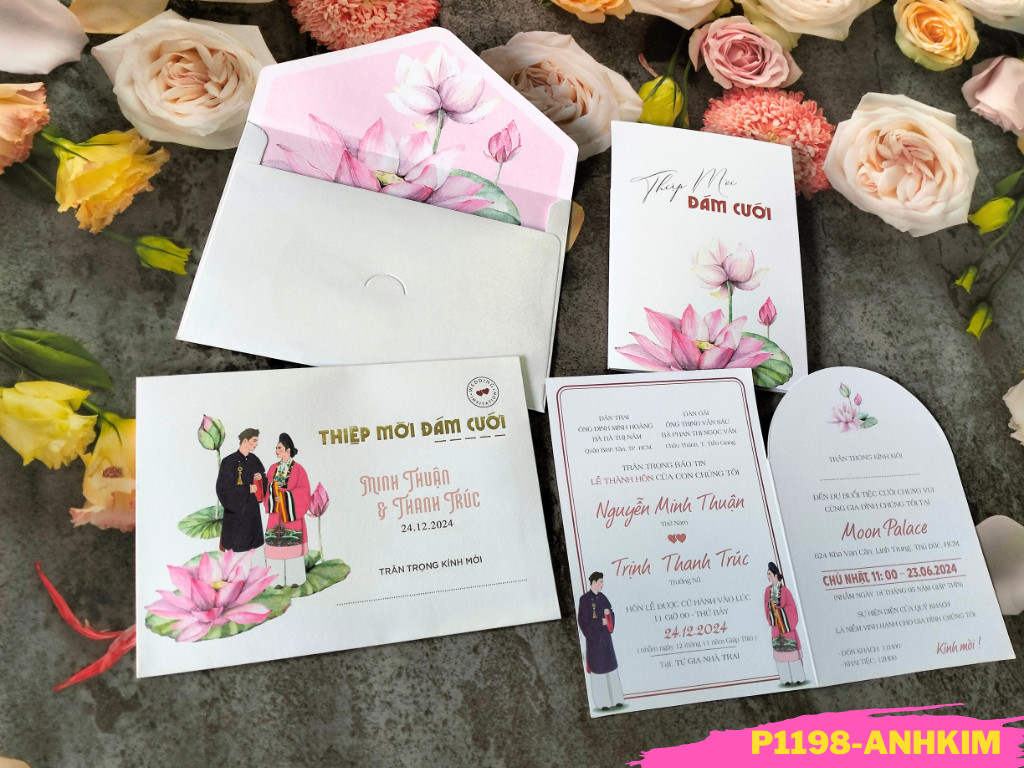 Mẫu Thiệp cưới giấy ánh kim thơm giấy dày màu xám hoa sen dâu rể