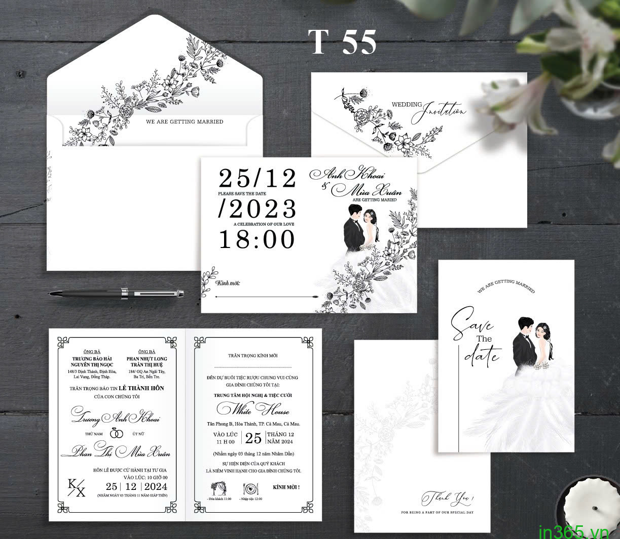 Mẫu thiệp cưới hiện đại kiểu ngang màu trắng offset dâu rể T55