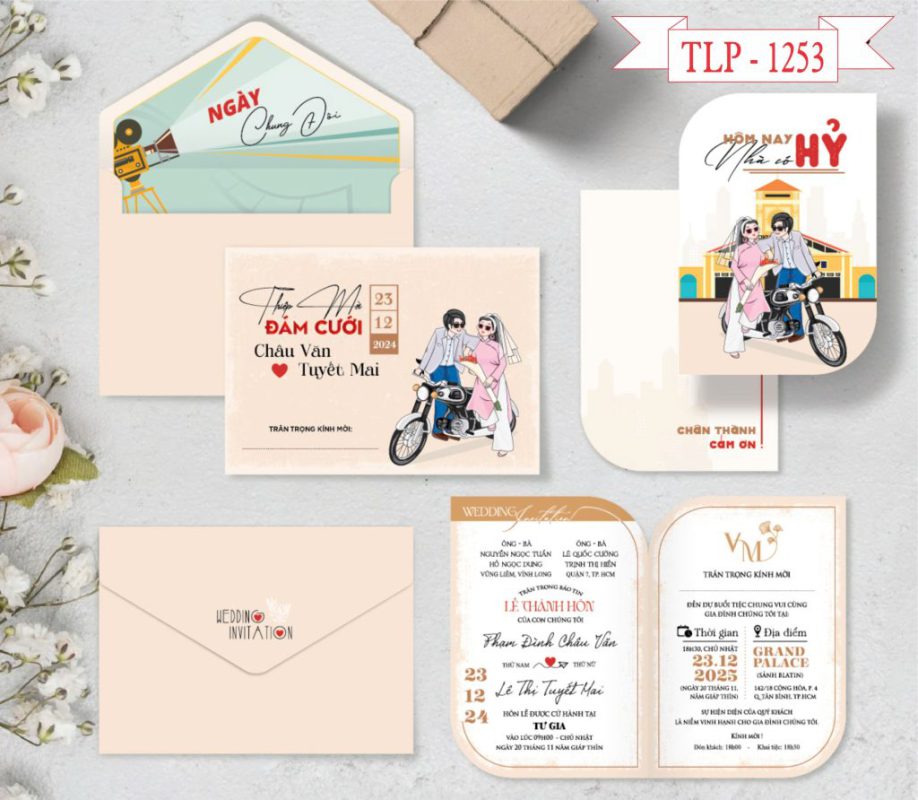 Thiệp cưới hiện đại offset khổ ngang kích thước 13x18cm, màu cam nhẹ phối trắng họa tiết chipi dâu xe 67 xưa