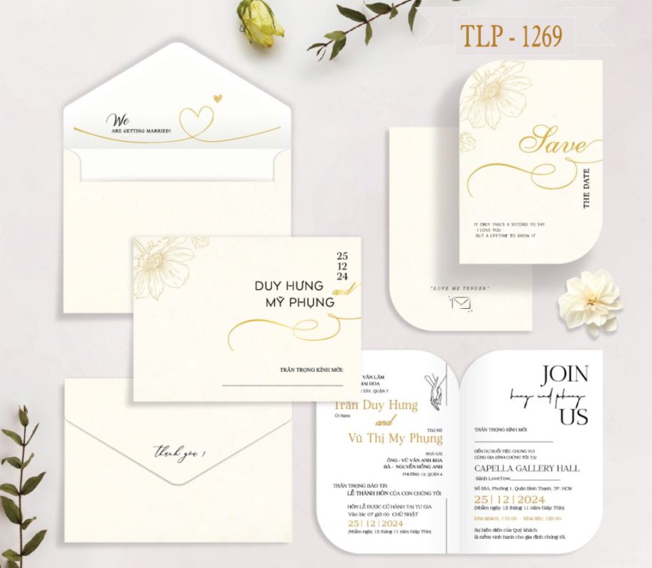 Dòng thiệp cưới hiện đại khổ ngang nắp chéo, ruột bo cánh bướm đẹp, giấy mỹ thuật dày in offset + ép kim