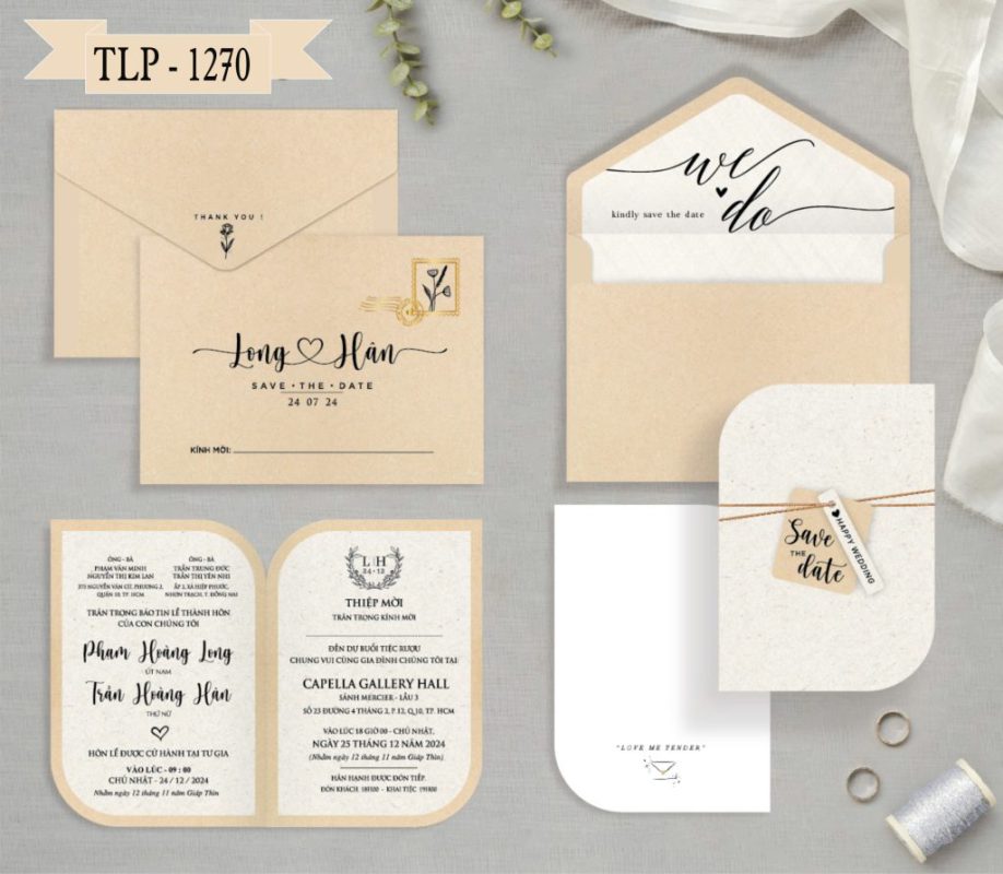 Dòng thiệp cưới hiện đại khổ ngang nắp chéo, ruột bo cánh bướm đẹp, giấy mỹ thuật dày in offset + ép kim